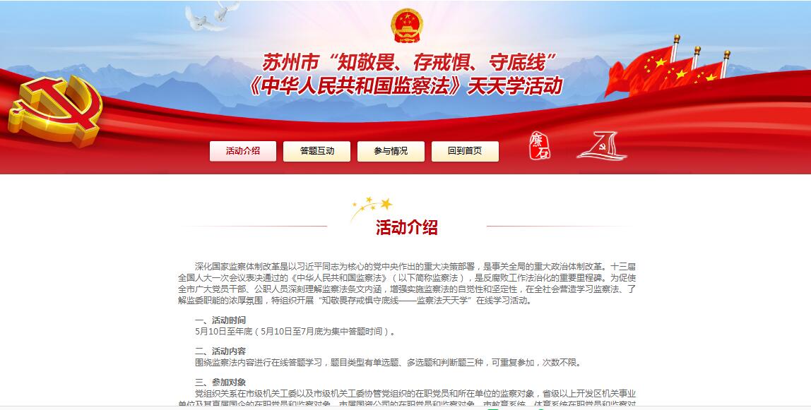 据介绍,参加者只要关注“清廉e苏州”、“苏州机关党建”微信号或者登陆苏州机关电子党务平台【苏州市“知敬畏、存戒惧、守底线——监察法天天学”在线学习活动】专题网页,就能随时随地学习监察法知识。“由于本次活动采用实名制登录学习,活动专题网页会实时统计显示各单位参与人员的答题情况,方便我们对参与情况进行督查考核,以确保学习实效。”苏州市纪委宣传部有关负责人介绍说。