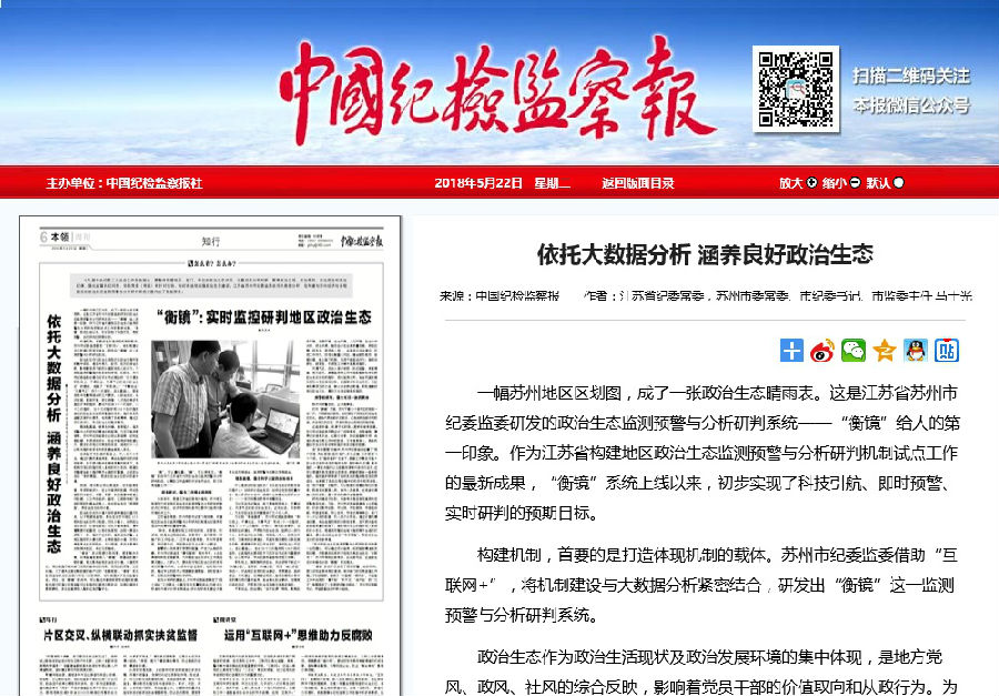 一幅苏州地区区划图,成了一张政治生态晴雨表。这是江苏省苏州市纪委监委研发的政治生态监测预警与分析研判系统——“衡镜”给人的第一印象。作为江苏省构建地区政治生态监测预警与分析研判机制试点工作的最新成果,“衡镜”系统上线以来,初步实现了科技引航、即时预警、实时研判的预期目标。