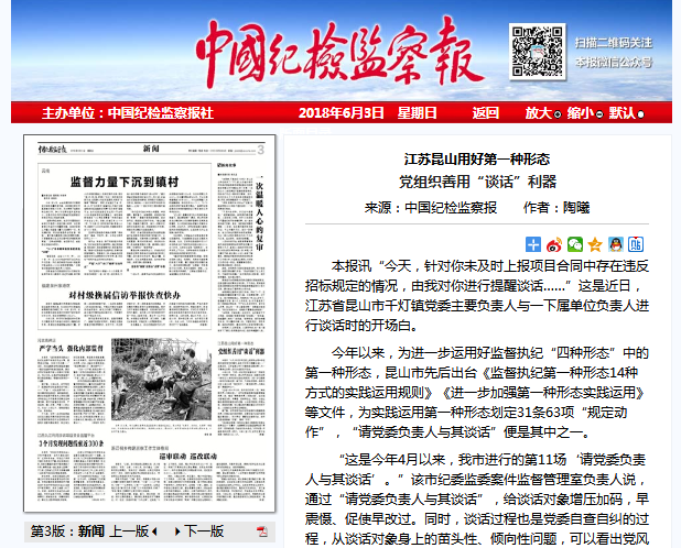 今年以来,为进一步运用好监督执纪“四种形态”中的第一种形态,昆山市先后出台《监督执纪第一种形态14种方式的实践运用规则》《进一步加强第一种形态实践运用》等文件,为实践运用第一种形态划定31条63项“规定动作”,“请党委负责人与其谈话”便是其中之一。