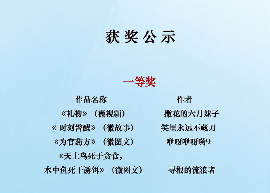 由苏州市纪委、监察局主办,相城区纪委、监察局承办,苏州日报报业集团全媒体中心协办的“廉石之光?阳澄清波”2016微言博语话廉政微作品征集活动自今年3月启动以来,得到了广大网友的积极响应和热情参与,活动组委会共收到各类微作品投稿800余件。经组委会组织专家评审,现将拟授奖作品公示如下。如对拟授奖作品的著作权存有疑议,请在8月19日17:00前向组委会办公室反映,电话:0512-68610329。